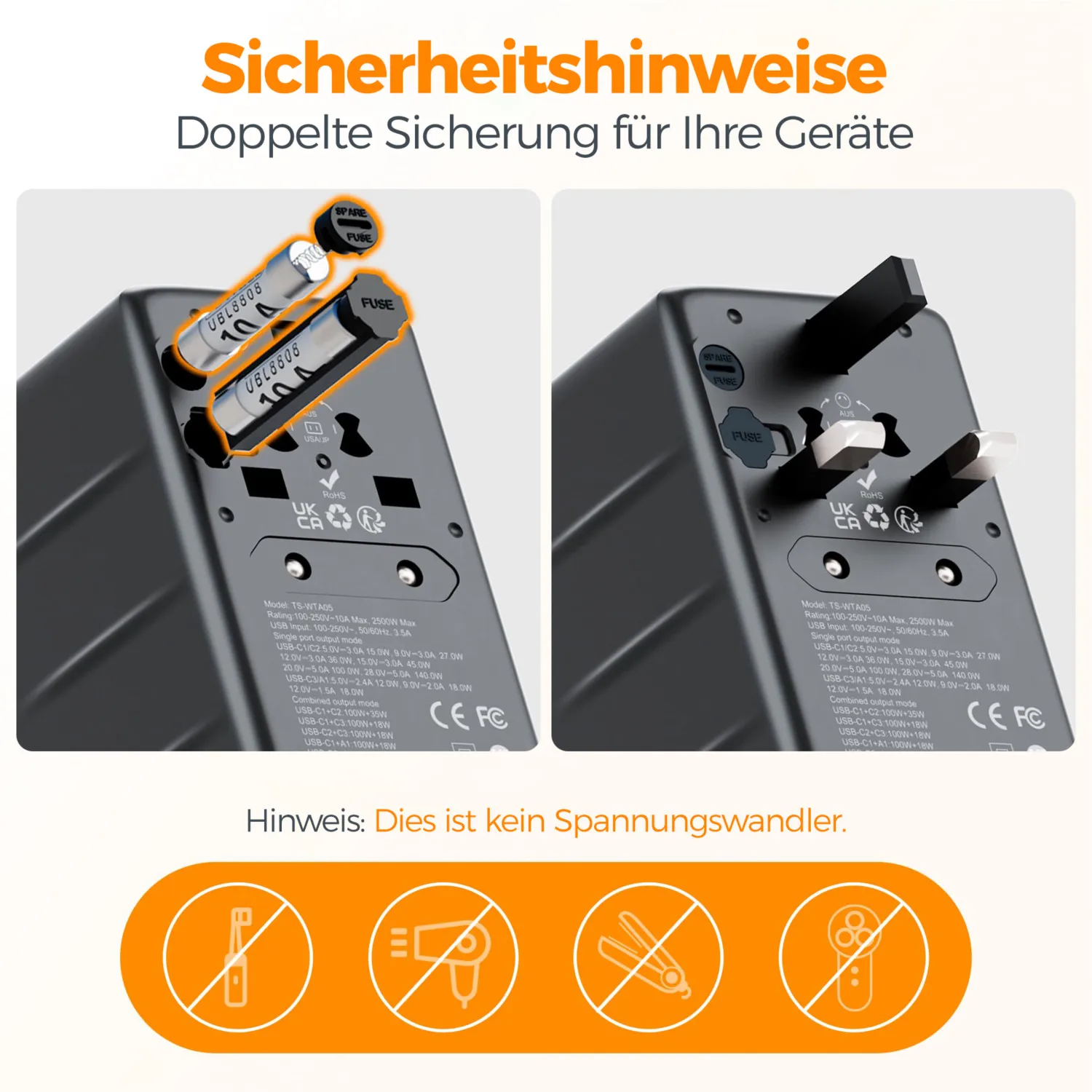 With double fuse, the power plug adapter effectively protects your devices and guards your travel security; NOTE: This universal outlet adapter travel only works on 100V to 250V wide voltage devices; The hair dryers, straighteners and curlers you use need to support wide voltages
