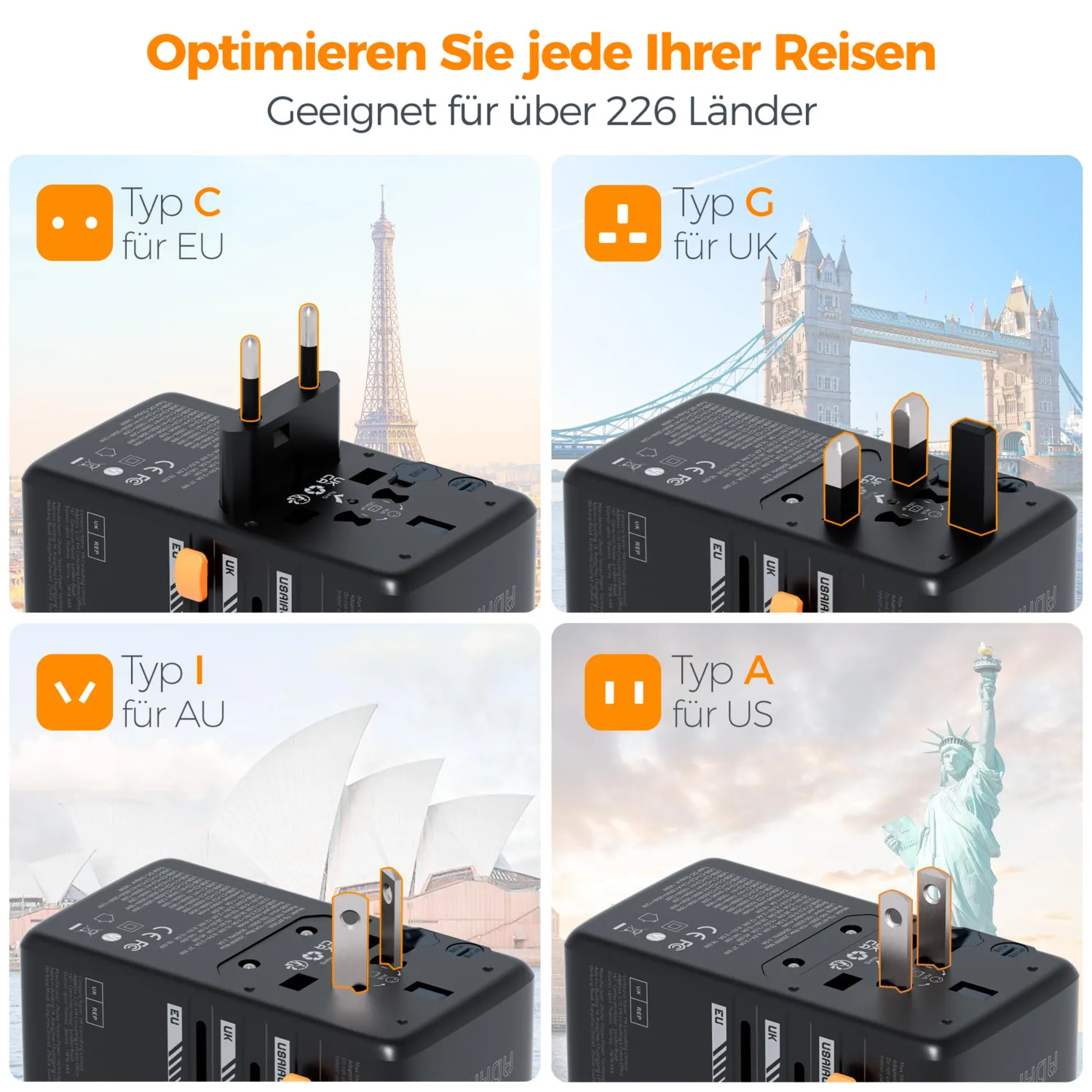 This universal adapter for travel covers over 200+ countries: (Type C )Korea, Germany, France, Italy, Spain, Iceland, Greece, Israel; (Type G) UK, Ireland, Singapore, London, England, Scotland; (Type I) China, Australia, New Zealand; (Type A)USA, Japan, Canada and more; Ideal for your worldwide travel or business trip.
